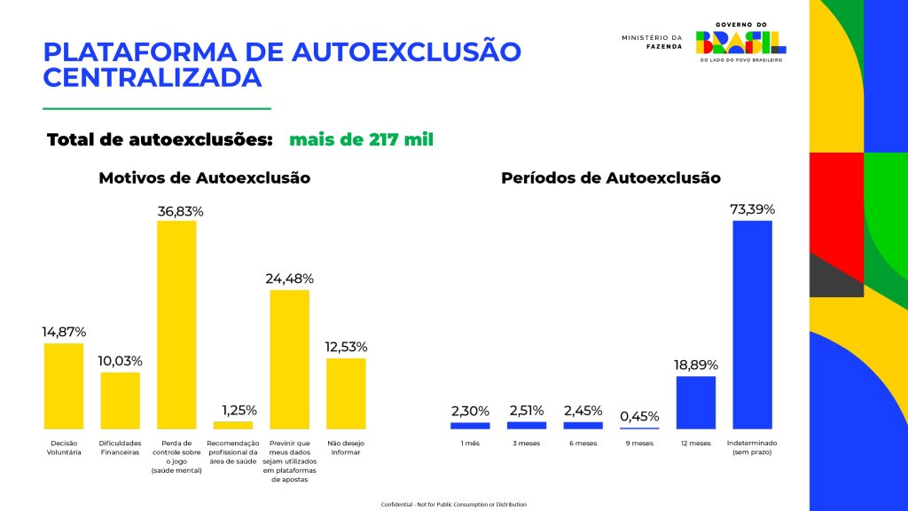 O panorama também apresentou os dados oficiais da Plataforma Centralizada de Autoexclusão, lançada pelo Ministério da Fazenda em dezembro de 2025, como parte da política de Jogo Responsável do governo federal. Segundo os dados, o sistema recebeu mais de 217 mil pedidos de autobloqueio de todos os sites de apostas em 40 dias.