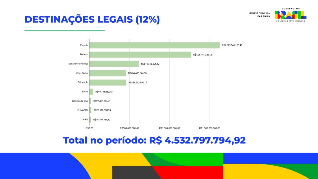 De acordo com os dados do panorama periódico, dos R$ 4,5 bilhões arrecadados pela taxa de 12%, R$ 1,6 bilhão foram destinados ao esporte, R$ 1,2 bilhão foram destinados ao turismo, enquanto R$ 614 milhões foram destinados à segurança pública e R$ 454 milhões à seguridade social, além de outras áreas.