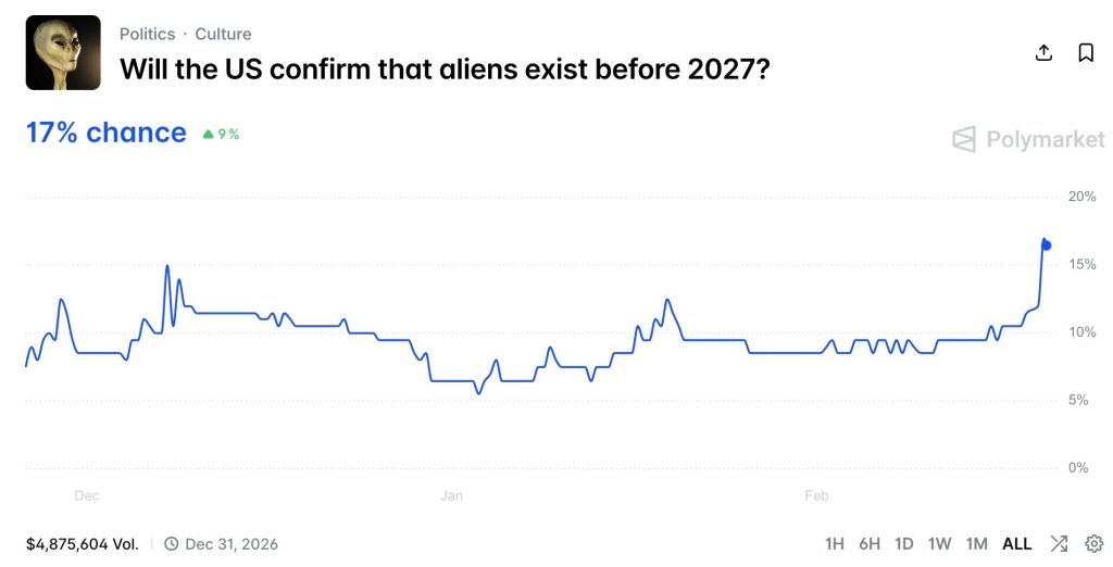 A resposta segue um mistério, mas uma coisa é certa: o mercado de previsão explodiu em volume de negociações depois que o presidente dos Estados Unidos, Donald Trump, prometeu liberar os chamados “arquivos alienígenas”.