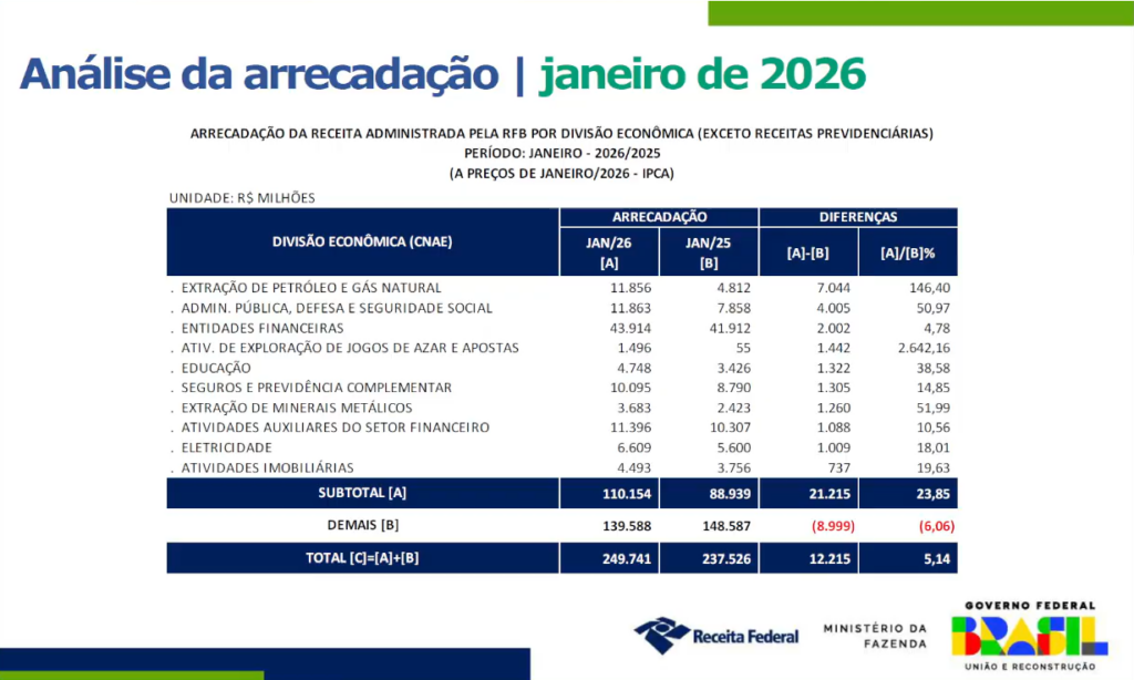 No total, em janeiro deste ano, a arrecadação do governo federal com impostos, contribuições e demais receitas somou R$ 325,8 bilhões. O valor representa alta real de 3,56% sobre o mesmo mês de 2025. Esse também foi a maior arrecadação já registrada em todos os meses desde o início da série histórica da Receita Federal, em 1995.
