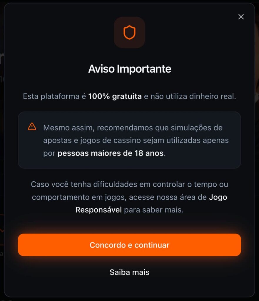 Logo no primeiro acesso à plataforma, o usuário é informado de forma clara que o Play365 é um ambiente 100% demonstrativo, sem qualquer envolvimento com dinheiro real. O aviso inicial também reforça que jogos com temática de cassino e apostas esportivas são recomendados exclusivamente para maiores de 18 anos, alinhando a experiência à responsabilidade no consumo de entretenimento digital. Esse primeiro contato não é apenas um aviso legal, é parte da proposta educativa do projeto, deixando explícito que a plataforma existe para simular, informar e conscientizar, e não para incentivar apostas reais.