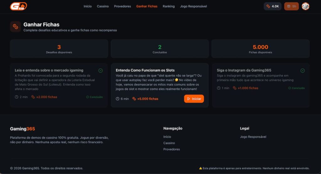 Ao acessar as demos, o usuário recebe fichas diárias para utilizar dentro da plataforma.