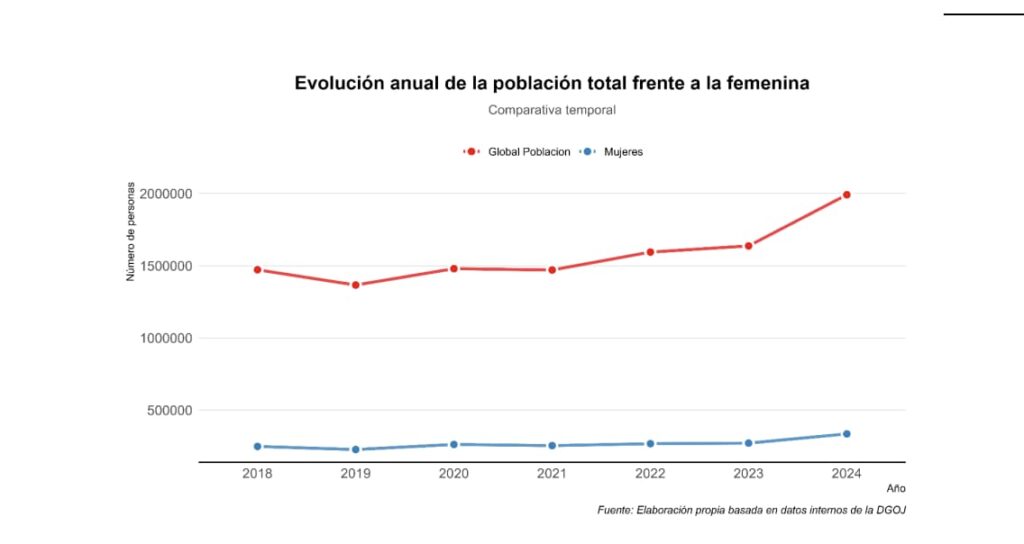 Em 2024, a Espanha registrou 1.991.550 jogadores online ativos, sendo 335.627 mulheres. O número confirma uma tendência de crescimento contínuo nos últimos anos, com aceleração recente.