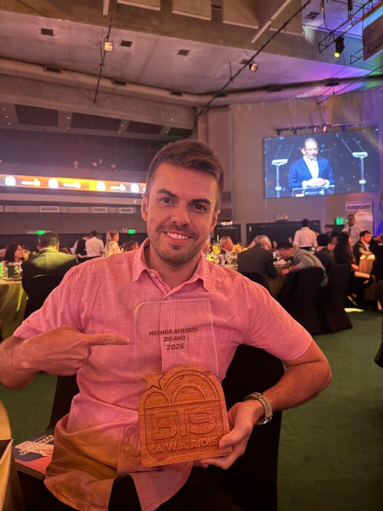 A noite do BIS Awards reservou surpresas para Bruno. Ele subiu ao palco duas vezes: primeiro ao ser eleito Profissional Destaque do Ano, e depois ao representar a Super Afiliados na categoria de Melhor Afiliado do Ano.