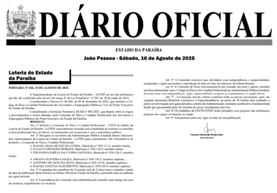 De acordo com a portaria assinada pelo superintendente da Lotep, Francisco Petrônio de Oliveira Rolim, os atos da Comissão seguirão integralmente as normas previstas no Código de Ética estadual, assegurando maior transparência e responsabilidade na atuação da autarquia.