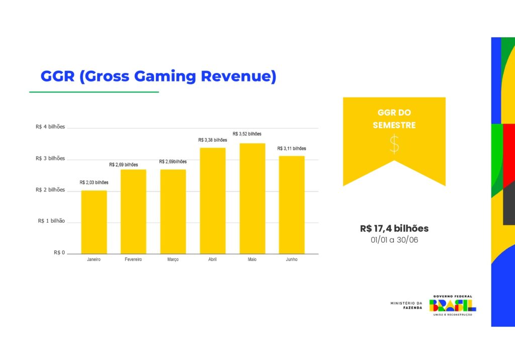 A receita bruta total das empresas autorizadas, o Gross Gaming Revenue (GGR), foi de R$ 17,4 bilhões no primeiro semestre. Esse valor representa o total de apostas, menos os prêmios pagos, o que pode ser indicado como o gasto efetivo dos apostadores no período. A média de gasto por apostador ativo é de cerca de R$ 983 por semestre ou R$ 164 por mês.