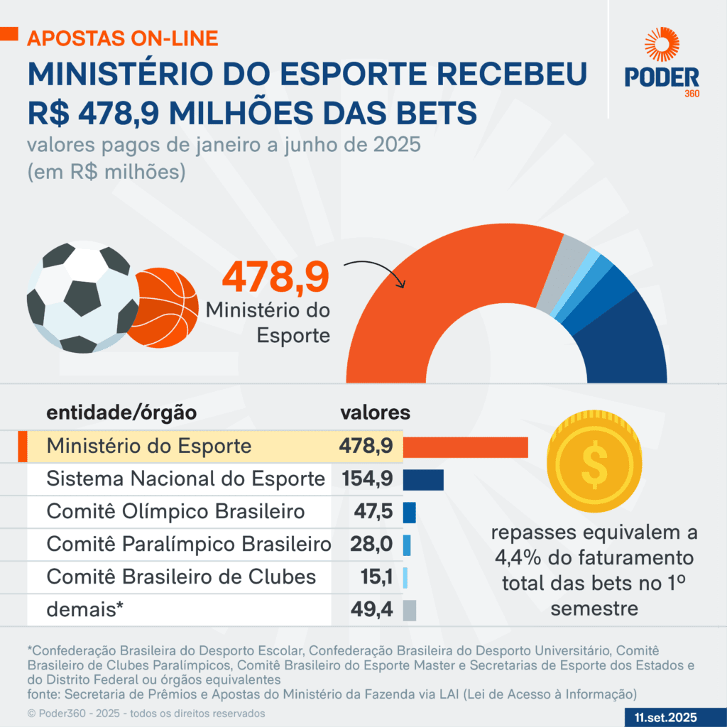 O Ministério do Esporte foi o órgão que mais recebeu recursos das empresas de apostas esportivas no primeiro semestre de 2025. Segundo dados da Secretaria de Prêmios e Apostas (SPA) do Ministério da Fazenda, obtidos pelo Poder360 via Lei de Acesso à Informação, a pasta recebeu R$ 478,9 milhões, valor que corresponde à maior fatia dos repasses obrigatórios previstos em lei.