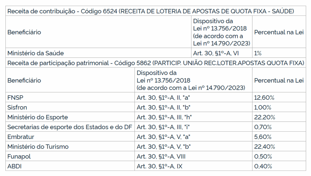 Outro ponto destacado é o código 6524 (Receita de Loteria de Apostas de Quota Fixa – Saúde), que corresponde a 1% da arrecadação destinada ao Ministério da Saúde. Já o código 5862 (Participação da União em Receita de Loterias de Apostas de Quota Fixa) abrange uma série de beneficiários, como o Fundo Nacional de Segurança Pública (12,6%), o Sistema Integrado de Monitoramento de Fronteiras – Sisfron (1%), o Ministério do Esporte (22,2%), as secretarias estaduais e distrital de esporte (0,7%), a Embratur (5,6%), o Ministério do Turismo (22,4%), o Fundo Nacional de Apoio à Política Nacional de Desenvolvimento da Atividade de Polícia Judiciária – Funapol (0,5%) e a Agência Brasileira de Desenvolvimento Industrial – ABDI (0,4%).