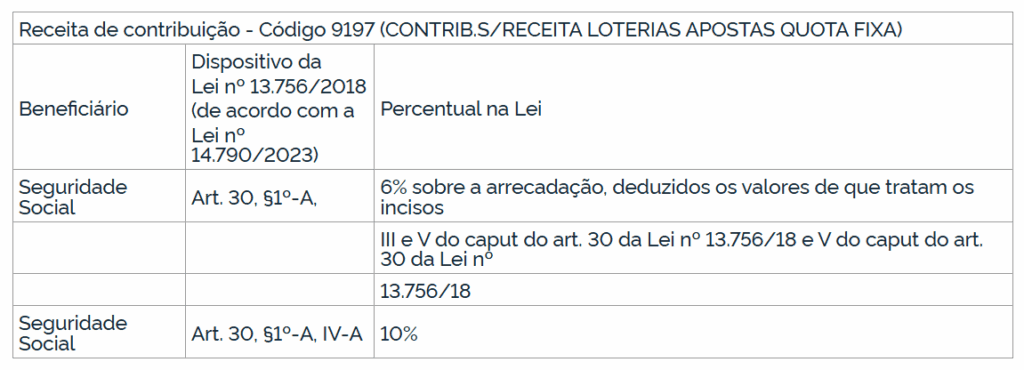 De acordo com o texto, o recolhimento passa a ser feito utilizando códigos específicos de receita, o que padroniza e confere maior transparência ao fluxo de recursos provenientes da arrecadação com apostas. O principal ajuste foi a criação do código 9197 (Contribuição sobre Receita de Loterias – Apostas de Quota Fixa), destinado às contribuições para a seguridade social. Pela regra, os operadores deverão repassar 6% da arrecadação para a seguridade, além de 10% adicionais previstos no inciso IV-A do artigo 30 da Lei nº 13.756/2018.