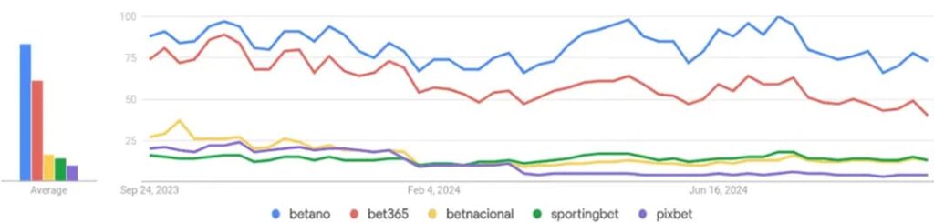 No topo do ranking, Betano se destaca novamente como a líder em termos de interesse de busca, ampliando a diferença em relação aos seus concorrentes. Bet365 segue em segundo lugar, mantendo um interesse consistente desde seu pico em 2023. Pixbet, por sua vez, superou Betfair, mostrando uma mudança notável em relação ao trimestre anterior.