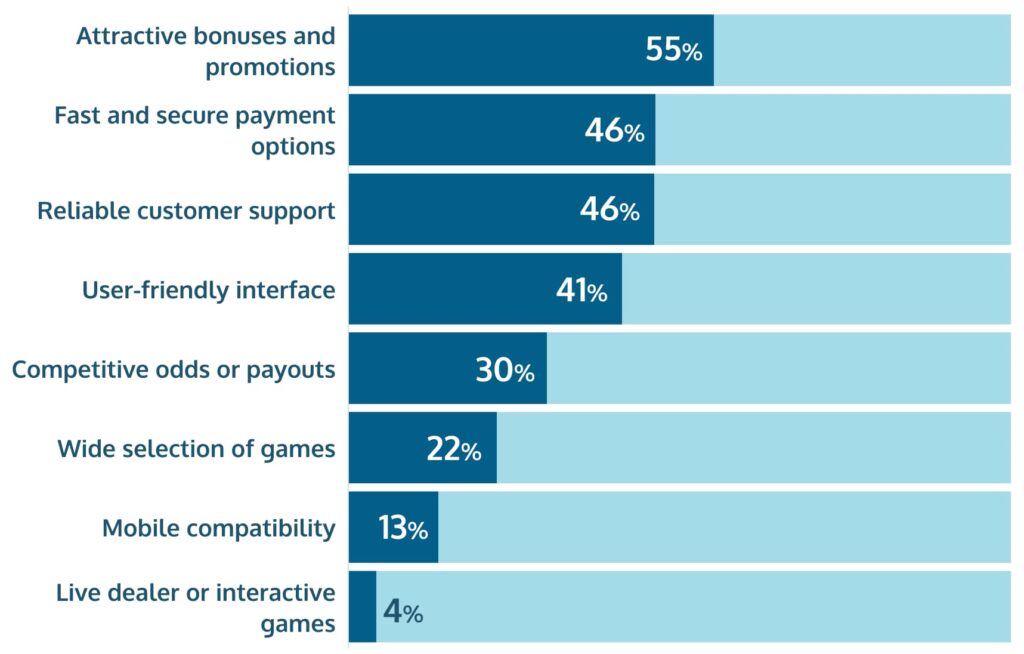 A pesquisa revelou que bônus atraentes e promoções continuam sendo os principais fatores para os jogadores brasileiros ao escolher uma operadora de jogos online, com 55,2% dos entrevistados destacando sua importância. Opções de pagamento rápidas e seguras, suporte ao cliente confiável e interfaces amigáveis também são altamente valorizados.