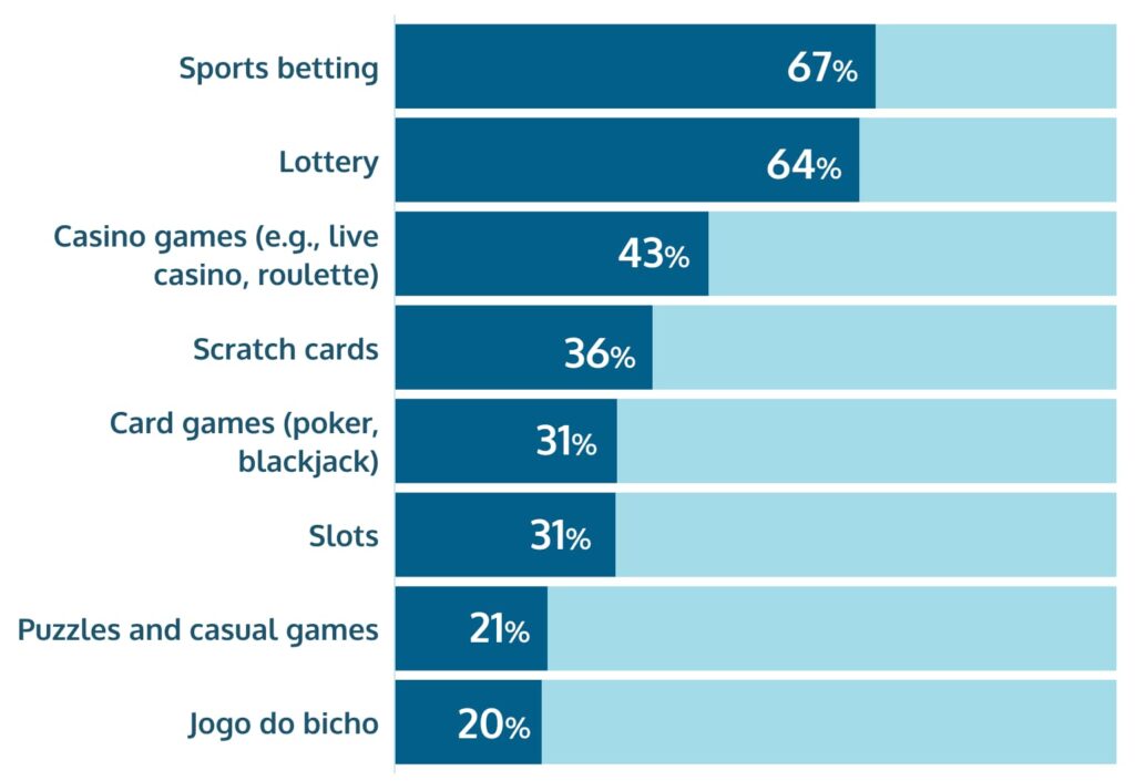 As apostas esportivas continuam a liderar entre as verticais de jogos mais populares no Brasil, escolhidas por 66,6% dos jogadores. As loterias seguem de perto, refletindo uma competição acirrada com produtos de jogos mais modernos. Os cassinos, especialmente os jogos de slots e crash, também mantêm uma base de fãs significativa.