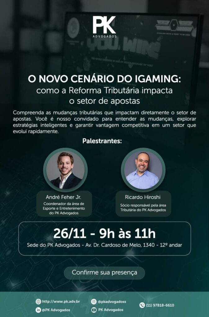 Para discutir essas transformações, o PK Advogados realiza no próximo dia 26 de novembro, em São Paulo, o café da manhã “O novo cenário do iGaming: como a Reforma Tributária impacta o setor de apostas”. O encontro reunirá profissionais da área jurídica e executivos do ecossistema para analisar, de forma prática, as mudanças trazidas pelos novos tributos.