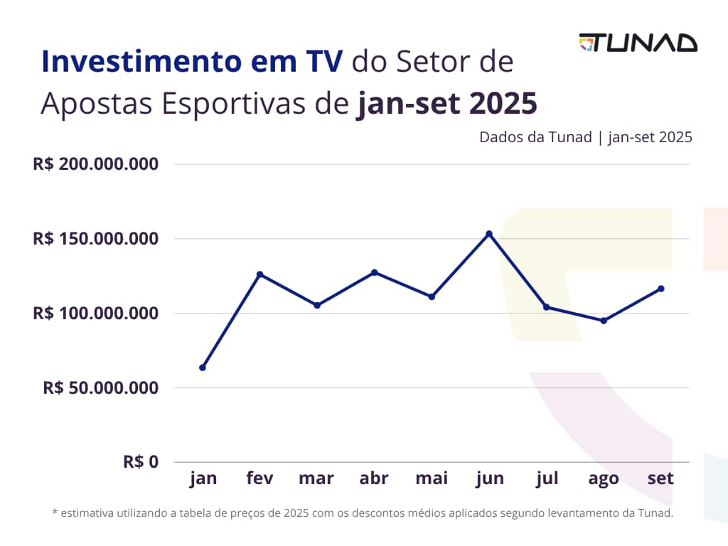 O estudo da Tunad também revela variações significativas nos investimentos ao longo do ano, diretamente influenciadas pelo calendário esportivo. Janeiro foi o mês com menor volume de investimento, totalizando R$ 66,7 milhões. Em contraste, junho foi o mês de maior investimento, com R$ 164,5 milhões, refletindo um aumento de 146,7% em relação ao início do ano. Esse pico coincide com as fases decisivas de campeonatos nacionais e internacionais, mostrando como as empresas de apostas alinham suas estratégias publicitárias com eventos esportivos de grande relevância.