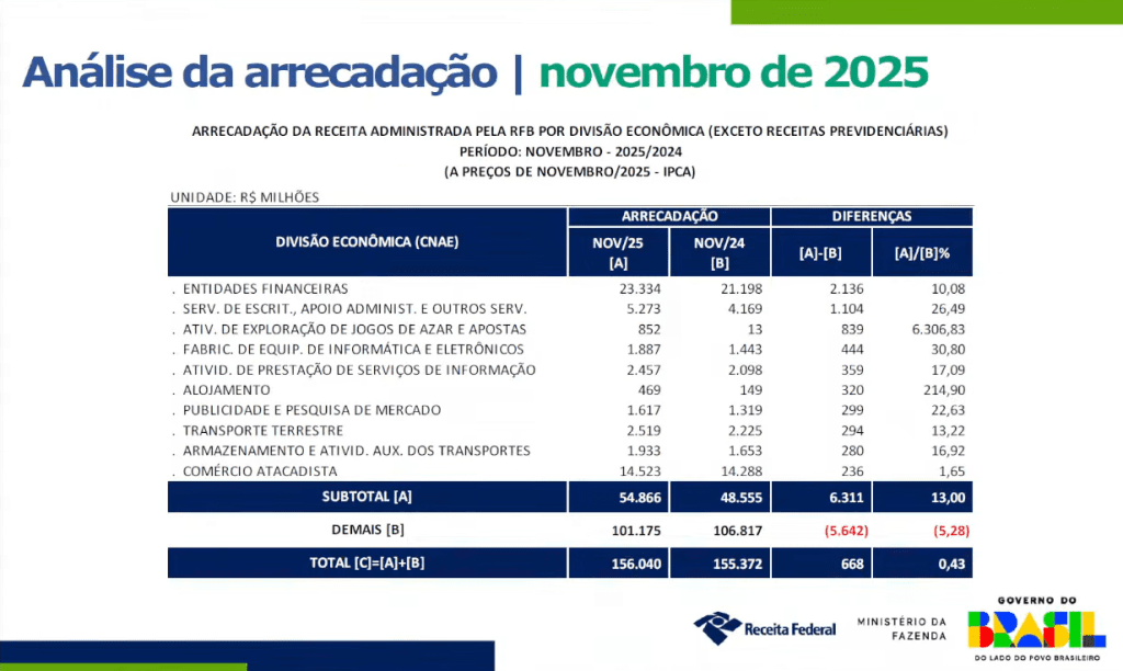Apenas em novembro, o governo federal arrecadou R$ 852 milhões com o segmento, um salto de 6.454% em relação a novembro de 2024, quando foram recolhidos R$ 64 milhões em um contexto de regras ainda em implementação.